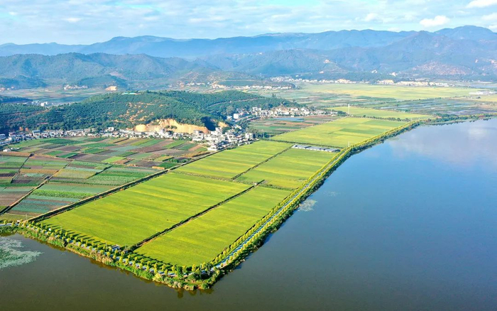 城东的异龙湖,流域面积360.4平方公里,湖面面积35.67平方公里,湖岸线长38.60公里,村落环水而居,云山倒映,浩渺烟波,如诗如画。沿岸神黄豆花、蓝花楹,百花竞放。山水与田园构筑的自然画卷,日常与诗意浇筑的人文画卷,让石屏有山水可寄情、有文化可共鸣、有臻味可细品、有归处可安心。