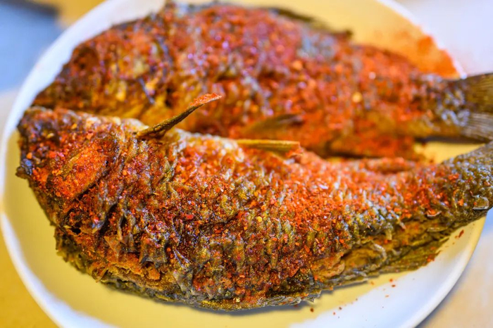 宝秀煎鱼选材讲究,鱼都是优质本地生态鱼,文火慢煎、小火窄油、手法圆熟、慢工细活,整鱼煎透通体金黄,保留鱼鳞,鲤鱼破肚去鳃后,不除鱼鳞,完整的鱼鳞形同挂糊,保证了外焦里嫩的效果、在制作过程中放入花椒、八角、草果、辣椒等调料,最后作出的鱼皮脆肉嫩、味道鲜美,能从肉里尝到爽辣的汤汁,滋味醇厚又清甜爽口。