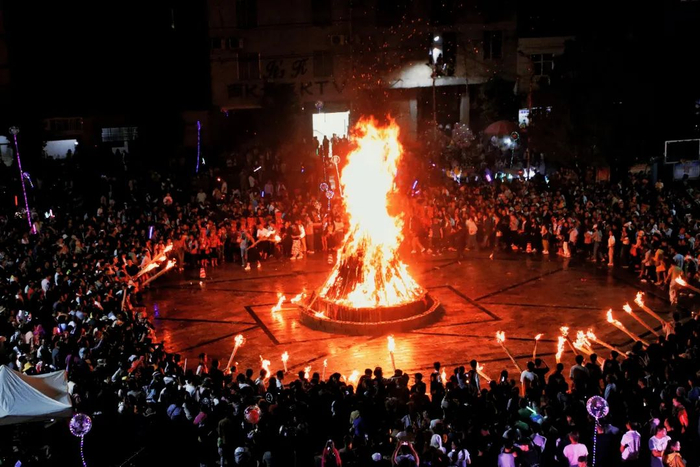 火把节,为农历的六月二十四。二十三日,在野外联户杀黄牛,牛肉按户均分,带回家煮熟祭祖。二十四下午,杀鸡招人魂。晚上各家各户的家庭主妇点燃一小火把,持着照屋内四周墙角,畜圈禽舍,口念“烧死蚊子苍蝇,烧除瘟疫疾病”,然后,扫点灰尘在簸箕里倒出村外,火把插在路边。这就是手持火把送瘟神。接着人们又另燃火把到自家田地里察看,照田祈丰年。孩童则持火把在街上斗架为戏。青年人把火把拿到野外,堆成篝火,围火欢歌乐舞。有的地方举行斗牛、摔跤,个别地方祭远祖和家祖。