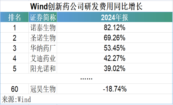 Wind数据显示,2024年,冠昊生物的研发费用同比减少了18.74%,仅排在创新药公司的第60位。其中,排名第1的诺泰生物,研发费用同比增长82.12%;第2名圣诺生物,同比增长69.26%;第3名华纳药厂,同比增长53.45%;艾迪药业位居第4,同比增长率42.27%;阳光诺和排在第5,同比增长率39.02%。