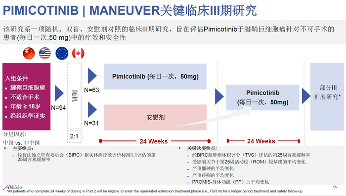 此次NDA申请获受理是基于匹米替尼优异的全球3期MANEUVER研究第一部分的研究结果。在该研究中,经盲法独立审查委员会(BIRC)评估,每日一次匹米替尼在第25周的主要终点客观缓解率(ORR)与安慰剂相比有统计学意义的显著改善(54.0% vs. 安慰剂3.2%;p < 0.0001)。
