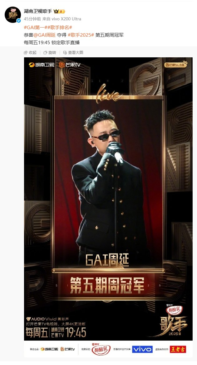 《歌手2025》第五期排名:GAI 周延第一!本人回应:上期第七很不开心!Grace第二!单依纯第三,卫兰淘汰
