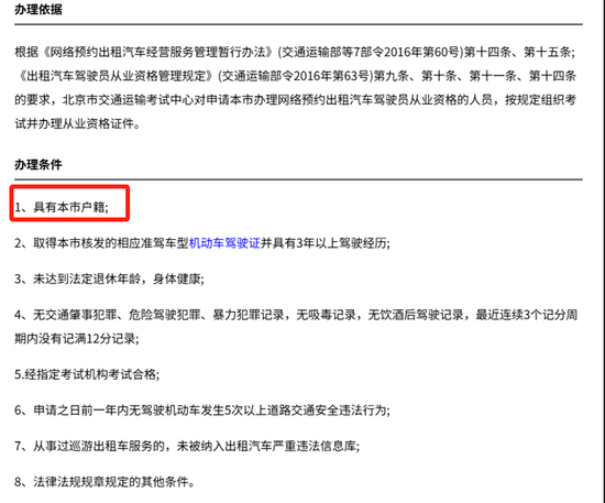 在“人证”方面,北京还是没有取消“具有本地户籍”的要求。即便是出租车,出租车公司大多是通过第三方公司外包的方式将车租给外地司机,严格意义上也不合规。