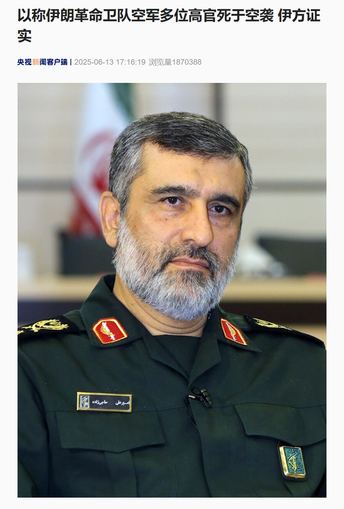 13日稍晚时,伊朗伊斯兰共和国通讯社宣布,伊朗伊斯兰革命卫队空军司令阿米尔·阿里·哈吉-扎德及一批空军战士殉职。