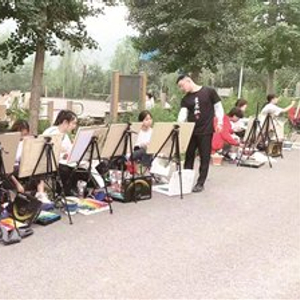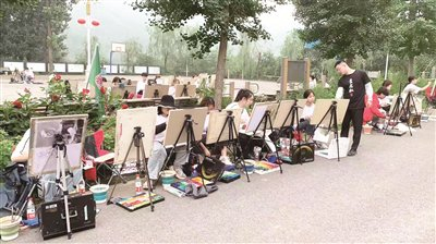 尝到“甜头”后,赵军更是想方设法为学生的绘画作品做起了推介活动。他还联合村民将学生的作品放到六渡河村栗花溪谷文创市集上进行展示,以此扩大写生基地的影响力。在村民的一阵阵吆喝声中,讨价还价声此起彼伏,欢声笑声交织在一起……通过宣传推介,大榛峪村学生写生基地的名号不胫而走,为后来的乡村特色游招来了不少游客。特别是一些亲子家庭得知大榛峪村有学生写生基地时,常带着自己的孩子来村里看大哥哥、大姐姐作画,以此培养孩子们的绘画情趣。