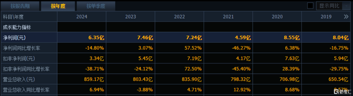 2024年公司实现营业收入859.17亿元,同比增长6.94%;同期实现归属于上市公司股东的净利润6.35亿元,同比下降14.80%。