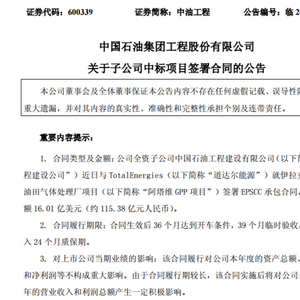 6月13日,中油工程公告称,公司全资子公司中国石油工程建设有限公司与TotalEnergies(以下简称“道达尔能源”)就伊拉克阿塔维油田气体处理厂项目签署EPSCC承包合同,合同金额16.01亿美元(约115.38亿元人民币)。项目达成临时验收的计划工期为39个月。