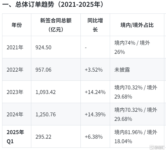 2025年一季度,公司累计新签合同额295.22亿元,同比增长6.38%。其中,国内市场新签合同额241.97亿元,占比81.96%;境外市场新签合同额53.25亿元,占比18.04%。