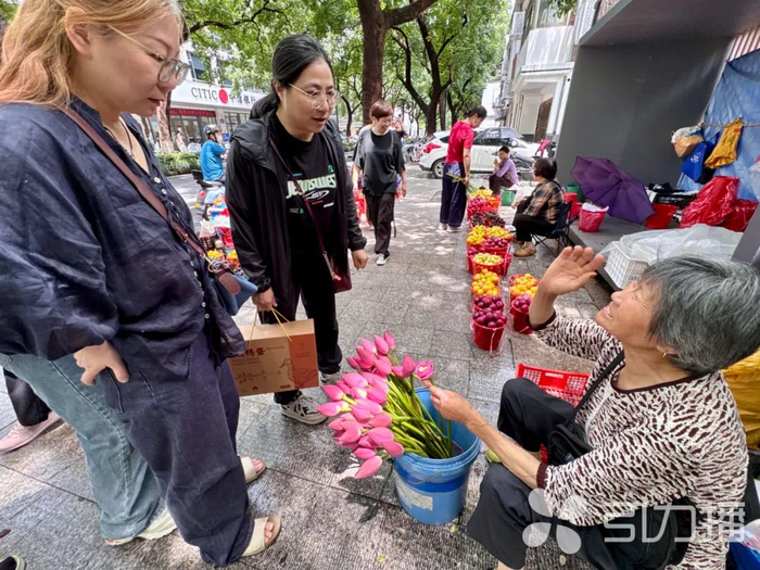 在白塔西路,一年一度的荷花市集如约而至。市集上,10元可购5支含苞荷花或4个青翠莲蓬,价格亲民引得游客争相选购。