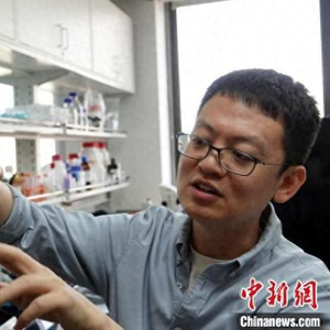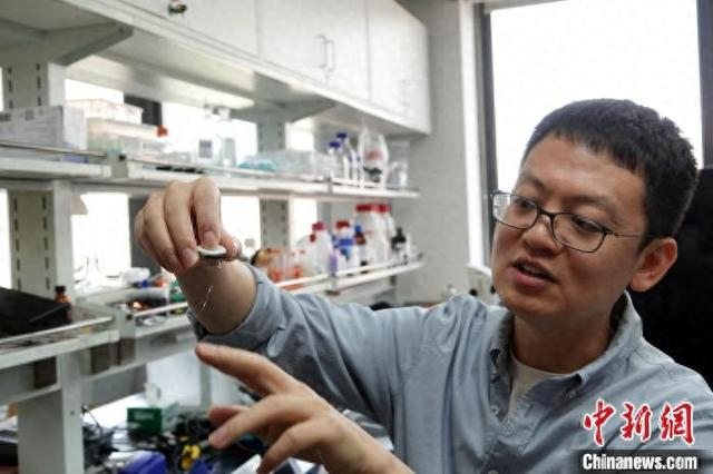 中国科学院脑科学与智能技术卓越创新中心赵郑拓研究员,向媒体展示介绍团队研发的目前全球最小尺寸、柔性最强神经电极。中新网记者 孙自法 摄
