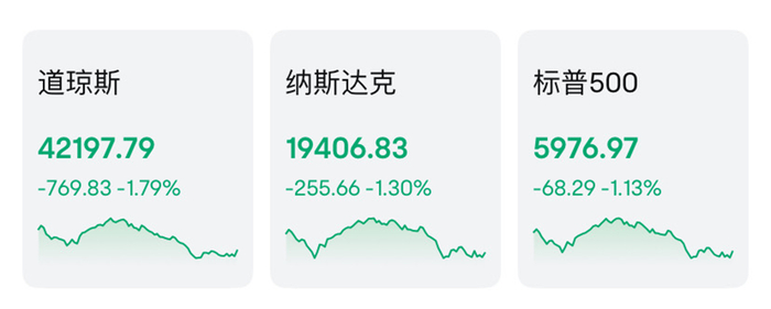 当地时间6月13日,美国三大股指全线收跌。截至收盘,道指跌1.79%报42197.79点,标普500指数跌1.13%报5976.97点,纳指跌1.3%报19406.83点。本周,道指跌1.32%,标普500指数跌0.39%,纳指跌0.63%。