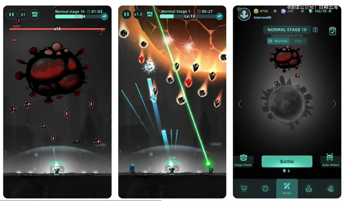 而更像塔防游戏的「Galaxy Defense」则拉长了关卡时间,每一关至少都有 5 分钟以上的时长,通过更循序渐进的难度设计来吸引玩家不断尝试和续命。这个思路此前在乐否科技的 Roguelike 射击游戏「Wing Fighters」里也有出现。通过把关卡拉长,玩家反而有了更强的代入感,感觉到自己的确在不断地挑战一波又一波的陨石和外星人,直到最后壮观的 Boss 战拉开帷幕。