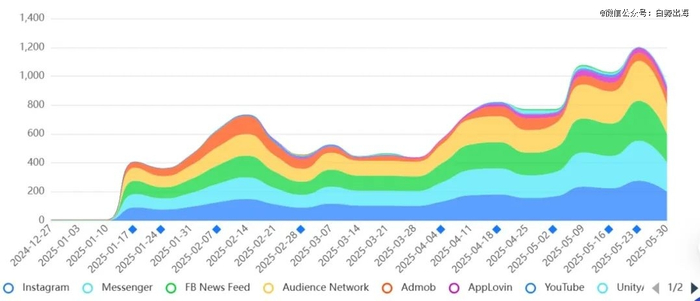「Mech Assemble」的内购流水从 2025 年 2 月开始*波增长,之后在 4 月迎来第二波增长,增速明显高于 2 月(上图);两次增长时间点和游戏 Google Play 端广告素材投放力度增加时间点相符(下图) | 图片来源:点点数据、广大大