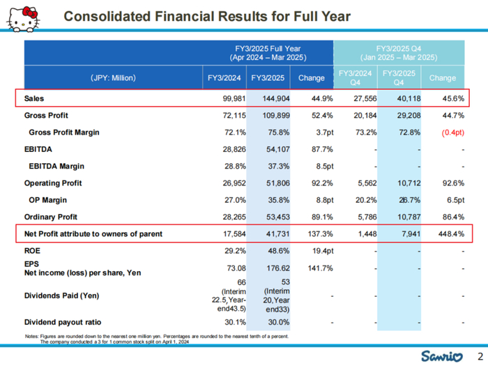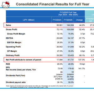 据悉,过去一年,三丽鸥股价涨幅超一倍。其2025财年(即2024年4月~2025年3月)财报则显示,三丽鸥净利润同比暴涨137%至417亿日元(约20亿人民币),销售额增长45%至1449亿日元(约72亿人民币)。
