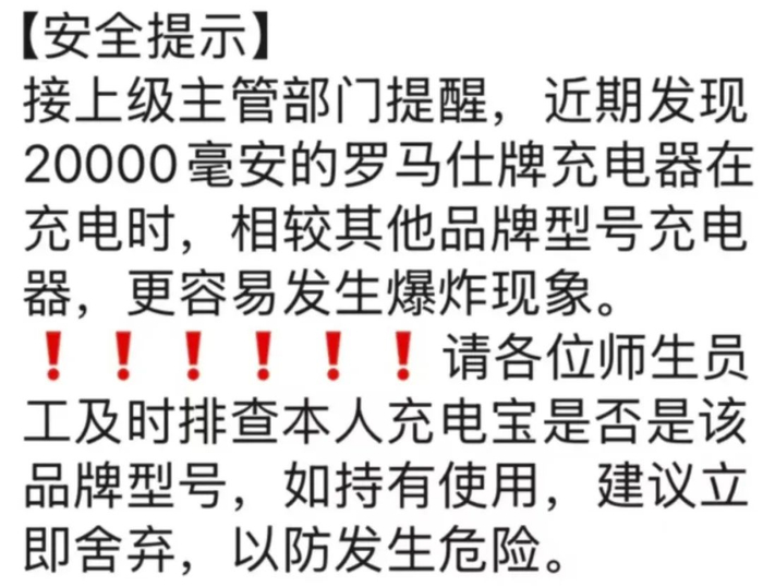 请各位师生员工及时排查本人充电宝是否是该品牌型号,如持有使用,建议立即舍弃,以防发生危险。