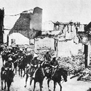 侵入宜昌的日军行进在残垣断壁的街头,摄于6月12日