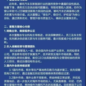 声明称,哪吒汽车将联合国内外头部产业资本共同投资,资金专项用于恢复生产、技术研发及海外市场拓展,同时优化重组原管理团队,引入具备跨国车企管理经验的资深人士担任新CEO。