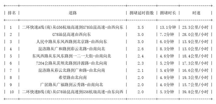 昆明道路拥堵排行榜top10: