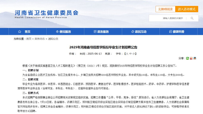 河南发布2025年特招医学院校毕业生计划招聘公告,招聘3200名医学院校毕业生。其中,研究生100名,本科生1100名,大专生2000名。