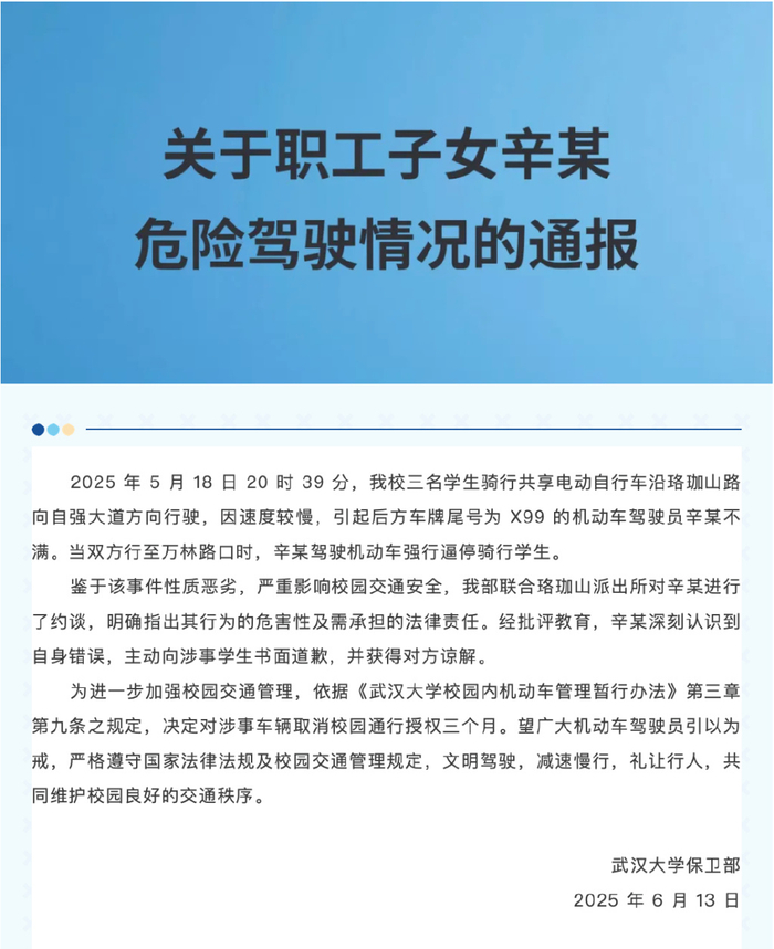 6月14日,武汉大学保卫部通报“职工子女辛某驾车强行逼停骑行学生”:三名学生骑行共享电动自行车因速度较慢,引发职工子女辛某不满,被其驾车强行逼停,严重影响校园交通安全,已联合派出所进行约谈。
