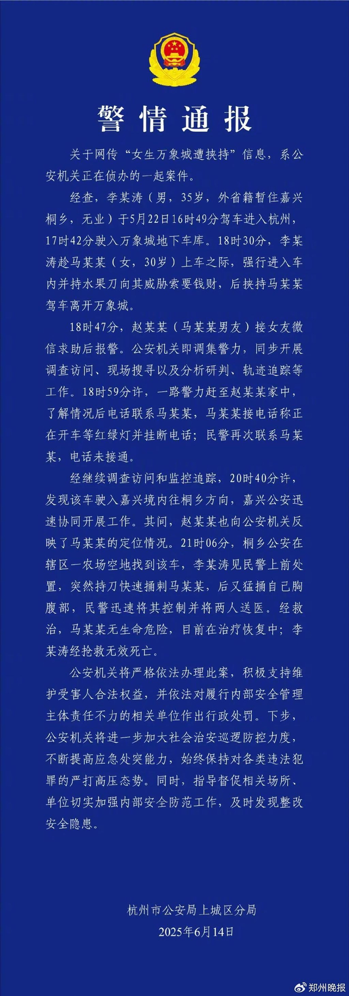 6月13日,“女生万象城地下车库遭绑架”一事引发关注。14日,杭州上城警方发布通报:李某涛(男,35岁)自杀身亡。
