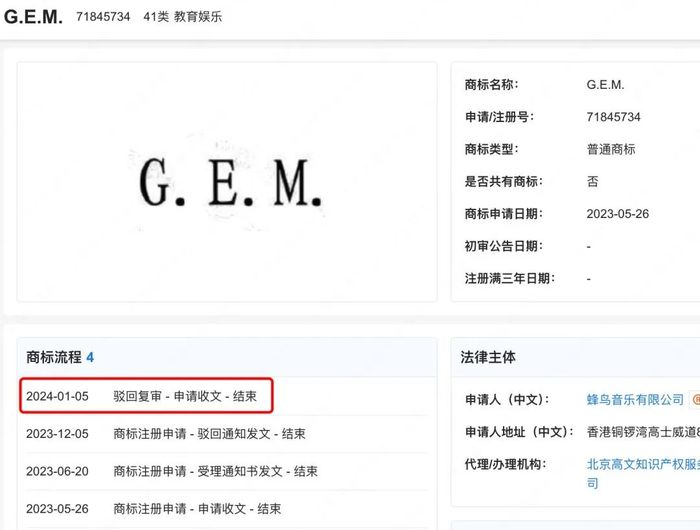 2019年,邓紫棋与蜂鸟音乐解约纠纷爆发核心矛盾:蜂鸟音乐声称拥有其《泡沫》《光年之外》等103首歌曲的录音制作者权及词曲版权,甚至试图通过商标注册强化控制——公开信息显示,蜂鸟在与邓紫棋发生纠纷后的2020-2023年间,仍然没有放弃持续申请“G.E.M.”“邓紫棋”商标注册,但是被商标局驳回,2024年更因连续三年未使用被撤销第15296857号“G.E.M.”商标注册。
