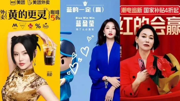 此外,当企业想要玩抽象又不想让老板亲自“下场”,找合适代言人也是好选择。最近,外卖平台掀起“颜色玄学大战”:美团请来“黄的赢”黄龄,饿了么找来“蓝的赢”蓝盈莹,京东外卖则是请惠英红——借用她“红的会赢”的谐音梗,营造别具创意的趣味互动。