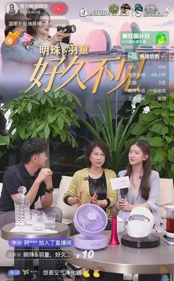 不仅声量爆棚,董明珠带起的直播风暴也迅速转化成购买力。5月23日,她与孟羽童合体直播当晚吸引了298万次观看、3万人峰值在线,带货额在250–500万元区间。6月10日的京东大型直播更是吸睛,在线观众突破800万,全天销售额达2亿元以上。