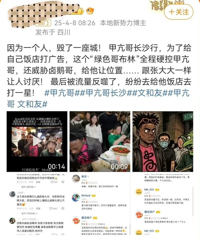 最具代表性的是文和友的翁东华。4月7日,他在顶流网红甲亢哥直播时疯狂“加戏”——直播乱窜、威胁发言,让整个事件像一场没有剧本的行为艺术。尤其他还突然对来自重庆的卤鹅摊主发出意味复杂的言辞:“我们都是开饭馆的,老弟我希望咱们能成为好朋友,长沙这地方咱得互相看得起,你起来我给你介绍下,不然明天我就去重庆了!”这番话带着“言笑晏晏”却暗含威胁,让人一瞬间不知是在看营销还是斗狠。