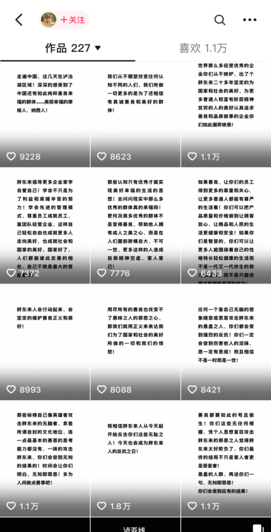 最典型的就是胖东来创始人于东来。6月9日凌晨,他在社交媒体连发24条动态,高频密集、情绪爆裂,怒斥攻击胖东来的“无耻之人”,称其“缺乏最基本的善恶思考能力”,并宣布“恶一定有恶报”。更将当日定为“胖东来人的反抗之日”,语气中带着一种不惜一战的决绝。
