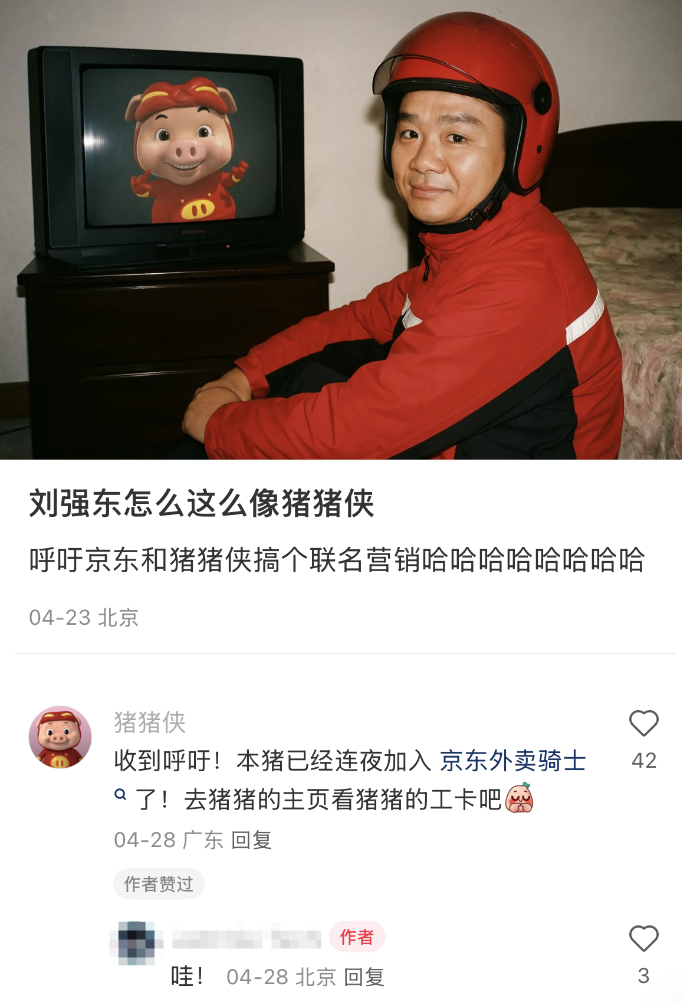 另一位擅长“以梗制梗”的,是京东创始人刘强东。今年4月,刘强东因身穿京东外卖工服的照片“撞脸”猪猪侠,被网友玩梗出圈。面对这波自发流量,京东干脆顺势操作,宣布与动画IP猪猪侠联名,打造联名T恤和外卖周边。到了5月10日,有网友在东京街头拍到刘强东穿着这款猪猪侠T恤,背后印着京东外卖二维码,引发新一轮社交平台传播高潮。这波操作不仅没丢面子,还用“创始人走在街头就是广告牌”的方式,把网络玩笑硬转成商业转化,全网看了都忍不住说:东哥,太懂流量了。