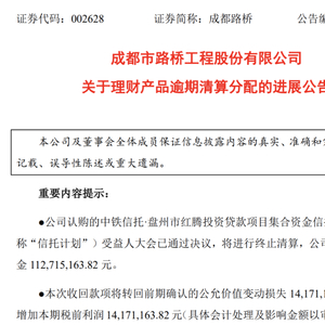 6月13日,成都市路桥工程股份有限公司(简称“成都路桥”)公告称,其认购的“中铁信托·盘州市红腾投资贷款项目集合资金信托计划”正式终止清算,公司可收回资金约1.127亿元,占原始投资本金1.56亿元的72.3%,本金损失达4328万元。