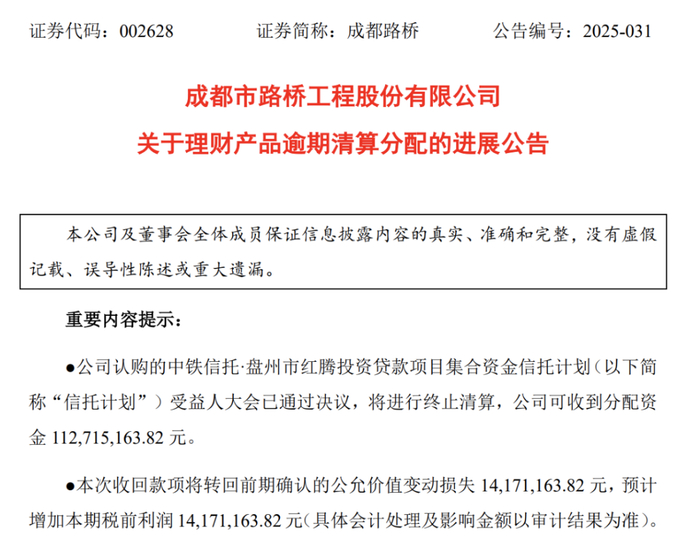 截至2024年末,成都路桥对该信托计划累计确认公允价值变动损失5745.60万元。本次收回款项后,公司将转回前期确认的公允价值变动损失1417.12万元,预计增加2025年税前利润1417.12万元(具体以审计为准)。公司表示,处置所得资金将全部用于补充流动资金。
