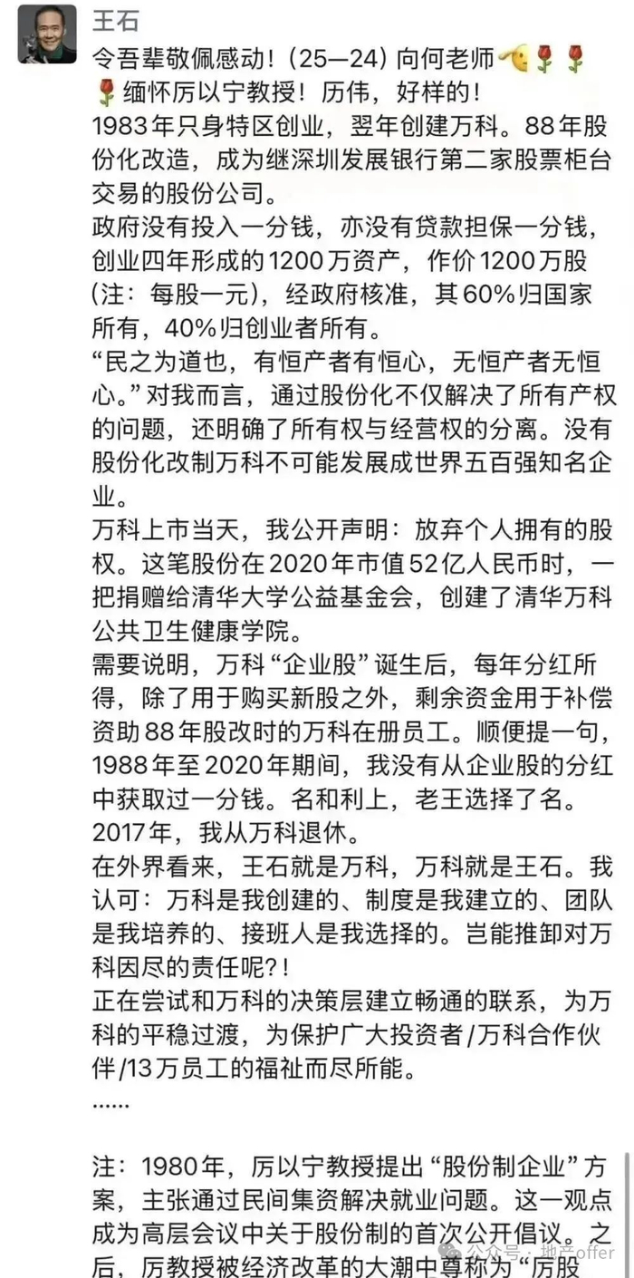 王石在文中简短回顾了自己1983年前往深圳特区创业,1984年创建万科,1988年股改,2020年放弃个人股权的经历。他特别说明,“万科‘企业股’诞生后,每年分红所得,除了用于购买新股之外,剩余资金用于补偿资助1988年股改时的万科在册员工。顺便提一句,1988年至2020年期间,我没有从企业股的分红中获取过一分钱。名和利上,老王选择了名。”