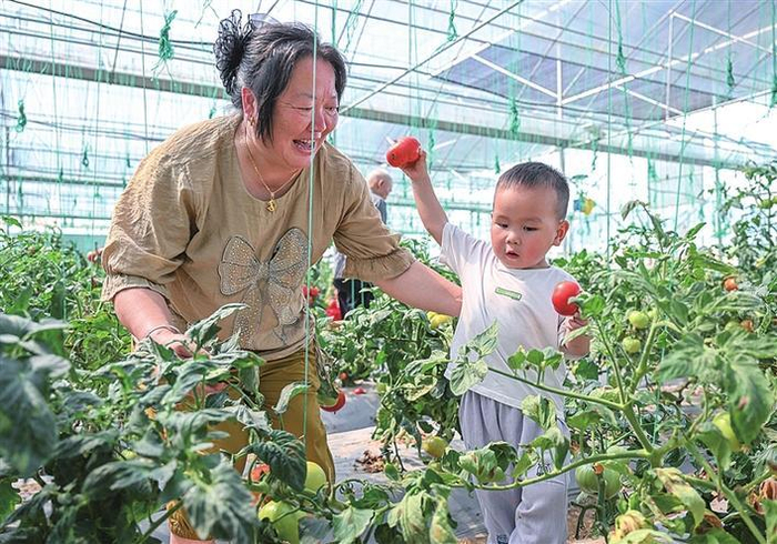 近日,重庆璧山夏季都市休闲农业嘉年华在七塘镇喜观村番茄小镇·果琳基地启幕,为市民、游客献上一场沉浸式田园体验。图为一位小朋友在家长的陪同下采摘番茄。新华社记者 陈 诚 摄