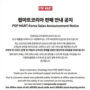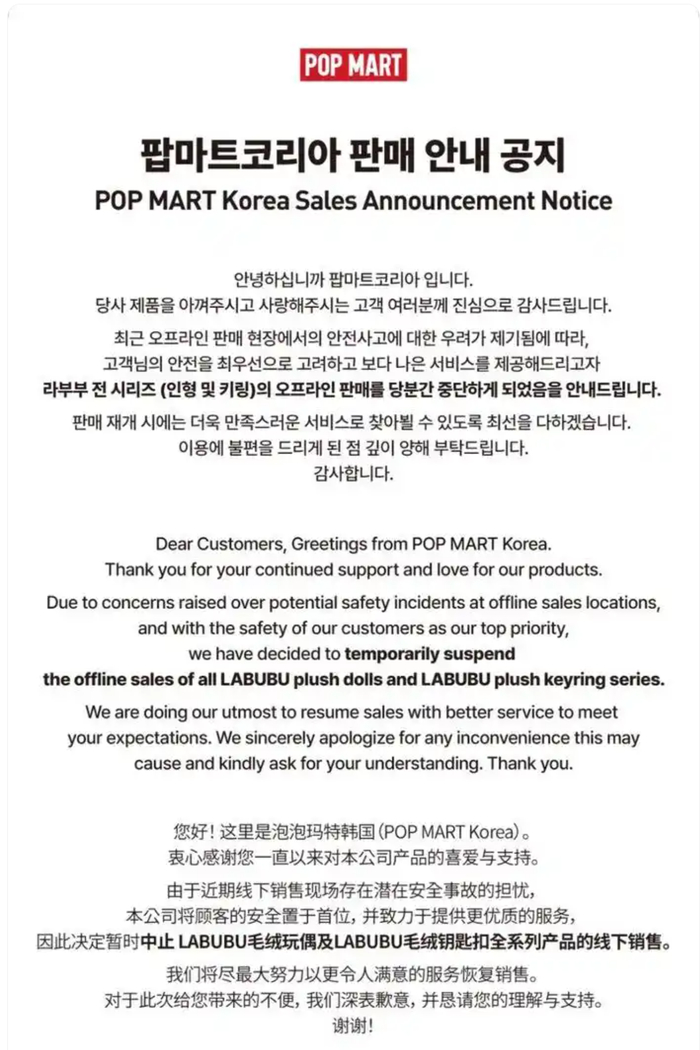 6月14日,泡泡玛特韩国发布公告称,由于近期线下销售现场存在潜在安全事故的担忧,决定暂时中止LABUBU毛绒玩偶及LABUBU毛绒钥匙扣全系列产品的线下销售。公司将尽最大努力以更令人满意的服务恢复销售。