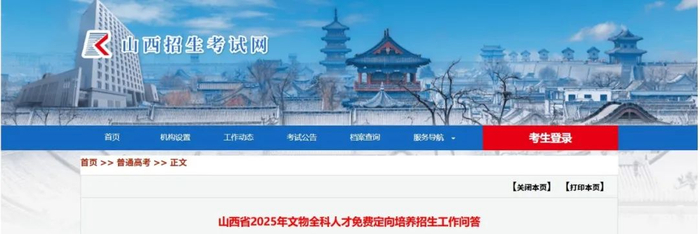 为加快推动我省文物事业高质量发展,进一步加强基层文物保护和考古队伍建设,根据《山西省文物局等5部门关于做好2025年文物全科人才免费定向培养工作的通知》(晋文物发〔2025〕5号)文件要求,我省2025年继续实施文物全科人才免费定向培养招生工作。