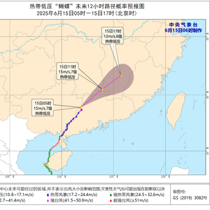 今年第1号台风“蝴蝶”已于今天(15日)早晨5点钟在广西壮族自治区贺州市八步区境内减弱为热带低压,其中心位于北纬23.9度、东经111.8度,最大风力有7级(15米/秒),中心最低气压为995百帕。预计,“蝴蝶”将以每小时40公里左右的速度向东北方向移动,强度继续减弱(见图1)。由于“蝴蝶”已减弱为热带低压,中央气象台于6月15日06时解除台风蓝色预警。