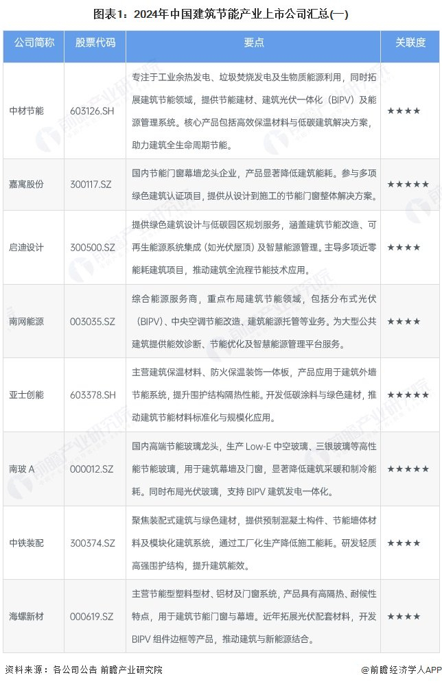 行业主要上市公司:中材节能(603126.SH);北新建材(000786.SZ);启迪设计(300500.SZ);南网能源(003035.SZ);亚士创能(603378.SH);南玻A(000012.SZ);中铁装配(300374.SZ)等
