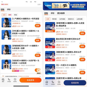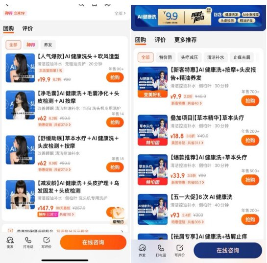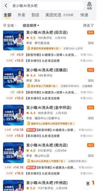 以一家名叫“发小咖AI洗头吧”的店铺为例,价值9.9元的AI洗头服务,包括头皮发质检测、AI智能健康洗头、全身按摩、营养产品涂抹、智能吹干等。此外,其还提供一些套餐服务。