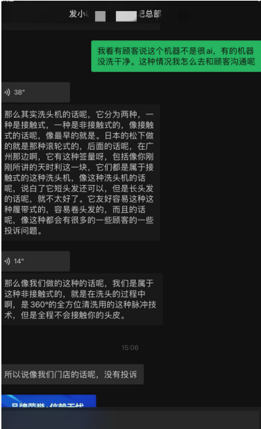 在记者提出AI技术的问题后,发小咖AI洗头吧客服发来一段视频,视频标题为“AI应用结合连锁创新不断,三点判断该不该逞AI概念”,视频开头即“现在连线下的服务业都学会用AI的概念去重构它的生态了”,而后客服表示其头皮检测以及洗头过程都能称为AI,“我们这个就是AI智能系统,不管我们的AI到底有百分之百还是百分之五十,只要有百分之十,他都算AI”,客服说。