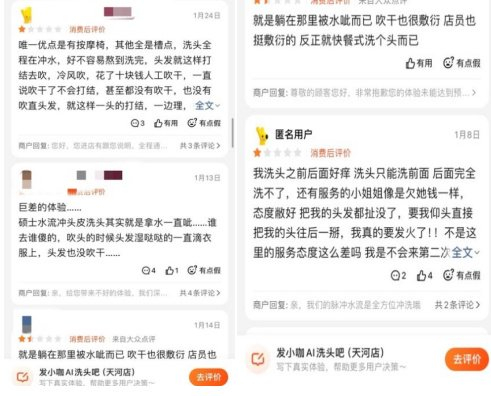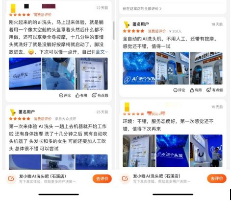 点开该店铺的评论区发现,其好评多称其价格实惠、有新奇科技感,如“AI洗头,一种充满科技感的洗头方式”“全自动的AI洗头机,不用人工,还带按摩”“科技感满满”……差评则多为洗不干净、不专业,如“洗完打结”“一般,没有洗头店专业”“就是用水冲一下而已,一点也洗不干净”“这个AI洗头,简直是智商税啊”……