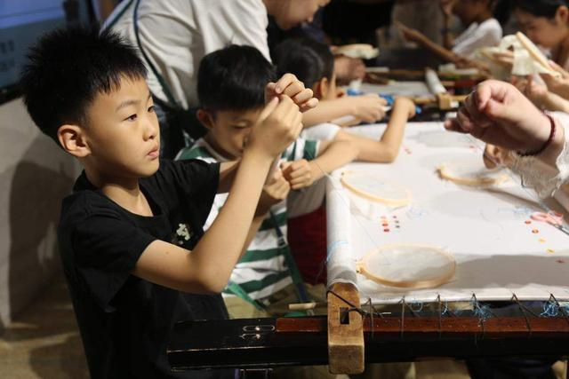 活动当天,山东博物馆在百工万物学塾内举办鲁绣体验特别活动。本次活动采用的绣样灵感源自山东博物馆两件馆藏珍品,亚醜钺和清乾隆粉彩三孔葫芦瓶。小朋友们在专业老师的带领下,亲手触摸丝线的温度,学习鲁绣的基本针法与构图,在一针一线之间绣出了属于自己的非遗记忆。