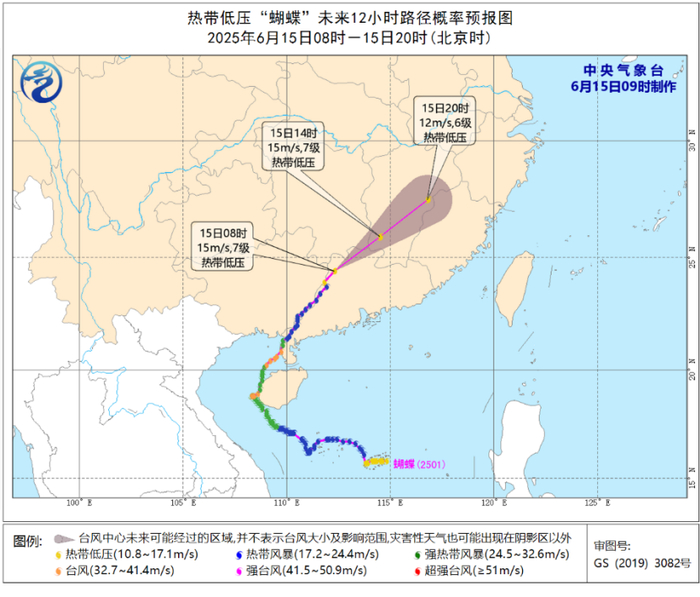 “蝴蝶”减弱为热带低压,向东北方向快速移动。今晨8点钟,“蝴蝶”的中心位于广东省清远市连南瑶族自治县境内,强度为热带低压,中心附近最大风力有7级(15米/秒)。未来,它将以每小时45~50公里的速度向东北方向快速移动,强度继续减弱。