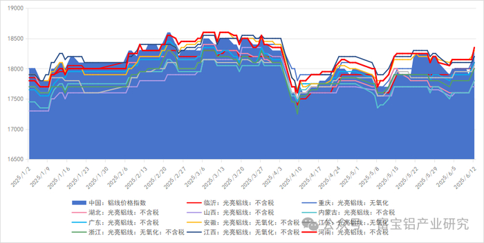 光亮铝线方面,截止6月12日,主流地区亮线价格集中在17900-18400元/吨之间,环比6月5日震荡上行,幅度300-400元/吨。本期原铝运行区间20160-20640元/吨,持货商逢高出货,市场流通货源趋于宽松,不过低价货源依旧稀少,厂家采购意愿下滑。