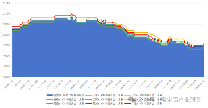 据富宝有色数据测算,截止2025年6月12日,华东地区ADC12成本为19378.4元/吨,相较2025年6月5日成本值上涨320.6元/吨;华南地区ADC12成本为20072.3元/吨,较2025年6月5日成本值上涨229.7元/吨。