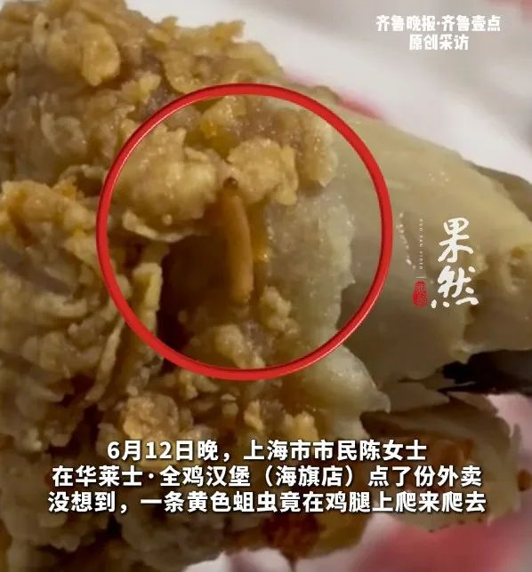 据齐鲁晚报消息,6月12日晚,上海网友陈女士在社交媒体发布视频称,她所购买的华莱士炸鸡腿中,竟然爬出了一条活的蛆虫。陈女士表示:“当时我整个人都不好了,要恶心死了!”