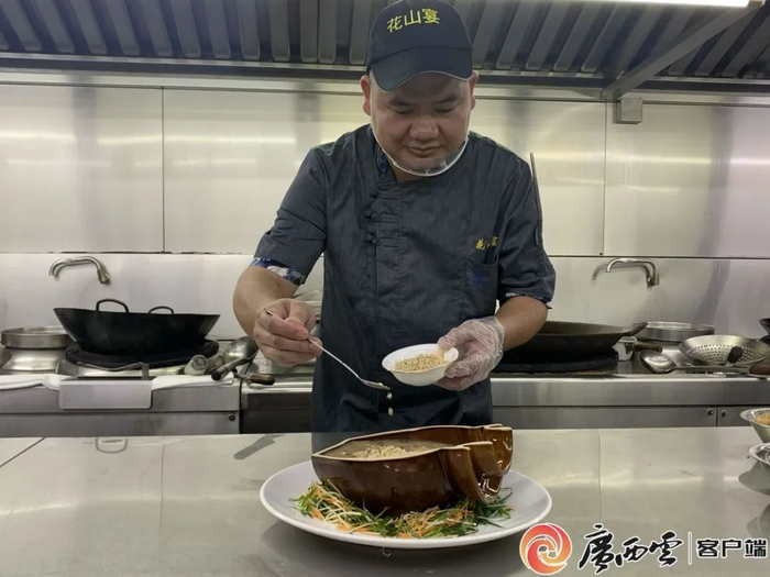 宁明花山宴酒楼里,行政总厨朱光艺凝神屏息。正演绎他的“十秒魔法”。热油刚起微烟,姜末、蒜末、洋葱末迅速入锅爆炒。待香气四溢时,酸粥倾入。与热油相遇,“滋啦”一声,诱人魂魄。“十秒!多一秒猪肚就老!”朱光艺紧盯计时器,手中铁勺翻飞,焯水后的猪肚条与紫苏、山黄皮等佐料在酸粥中交融翻滚。片刻之后,一盘脆嫩弹牙、酸香四溢的酸粥猪肚便完美出锅。