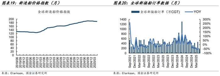 25年5月,全球新船价格指数达186.69,同比+0.14%,较2020年周期低谷提升49.28%,看好船企盈利能力持续提升。