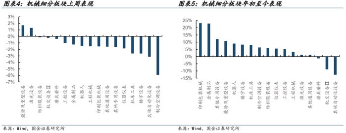 2025年至今表现:2025年初至今,机械细分板块涨幅前五的板块是印刷包装机械/金属制品/其他专用设备/能源及重型设备/机器人,涨幅分别为23.19%/22.90%/12.16%/10.79%/9.02%。